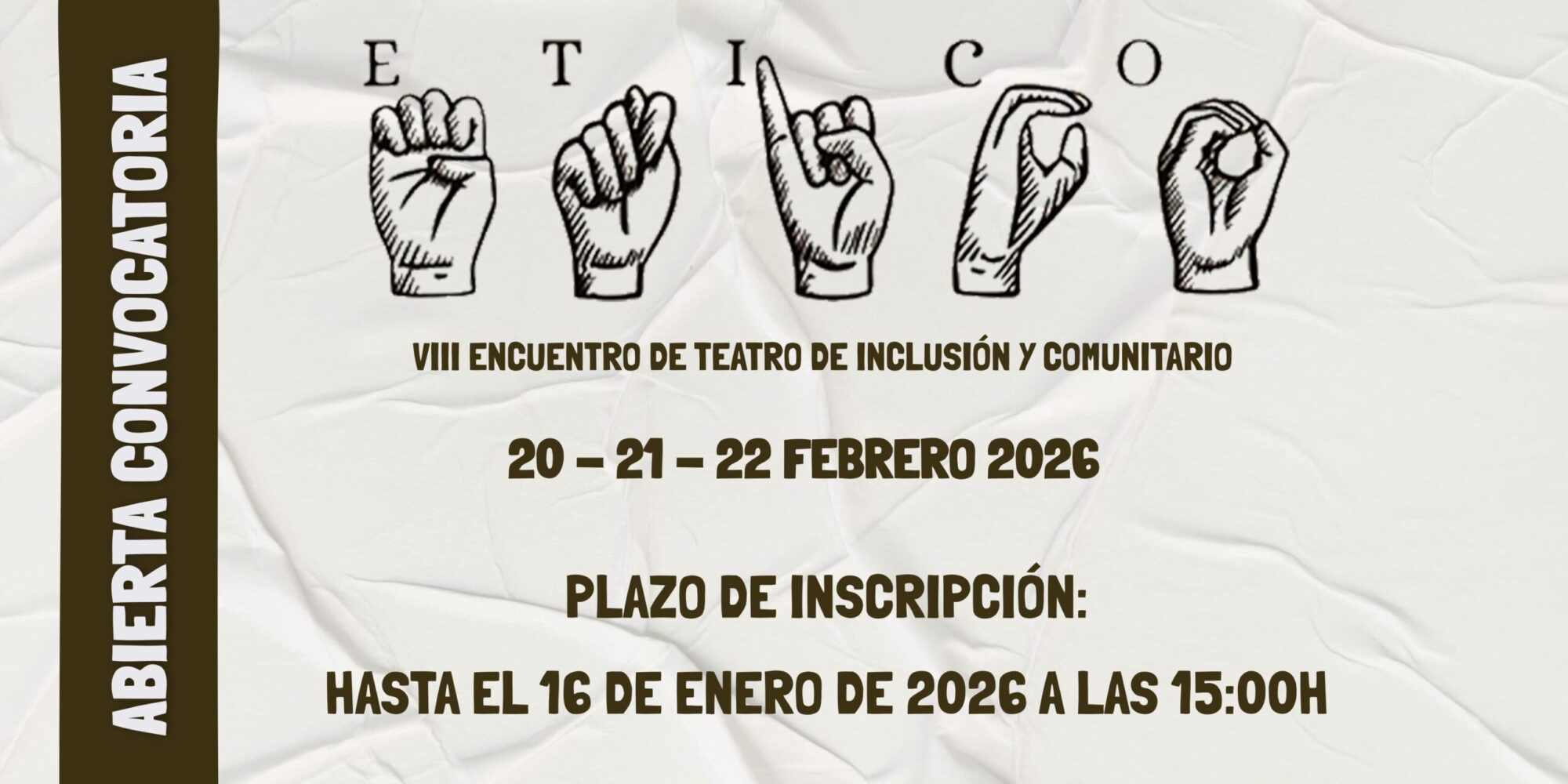 El Teatro TNT abre el plazo de inscripción para la VIII edición del Encuentro De Teatro De Inclusión Y Comunitario (ÉTICO), que tendrá lugar del 20 al 22 de febrero de 2026. Las compañías que deseen formar parte de la selección deberán cumplir los requisitos establecidos en las bases publicadas, a continuación, en la web de TNT. El plazo de presentación de propuestas finaliza el día 16 de enero a las 15:00 horas.